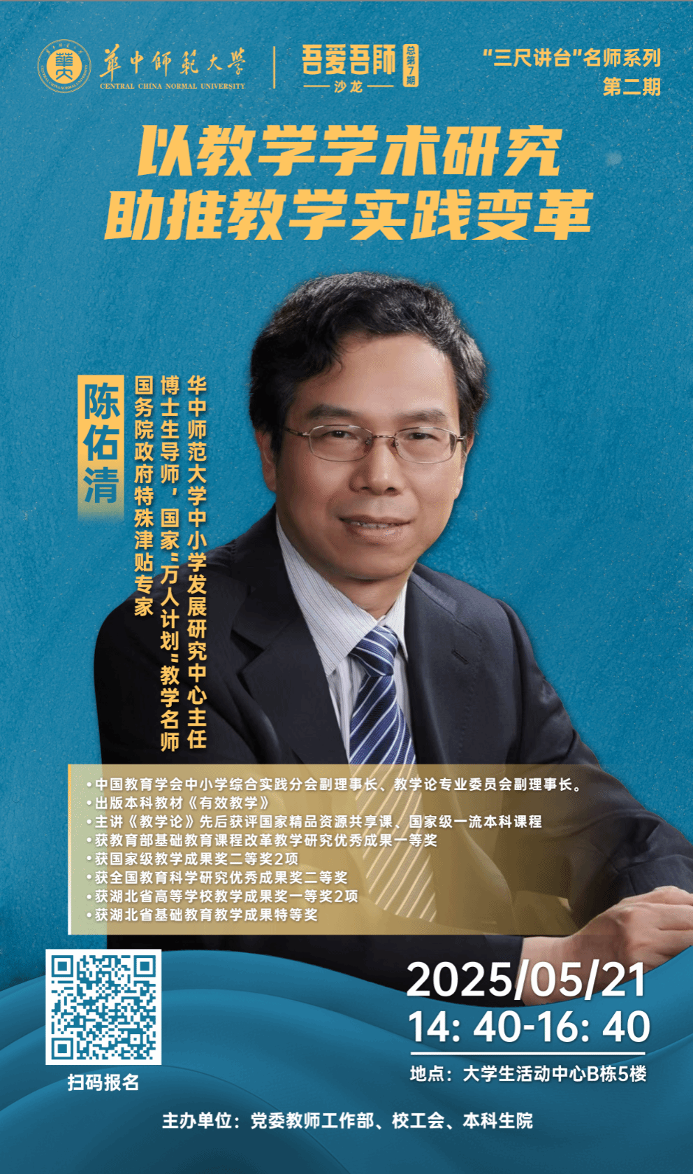 主讲嘉宾:陈佑清教授,教育学博士、二级教授、博士生导师。系湖北名师、国家“万人计划”教学名师、国务院政府特殊津贴专家。现任华中师范大学中小学发展研究中心主任,兼任中国教育学会中小学综合实践分会副理事长、教学论专业委员会副理事长。