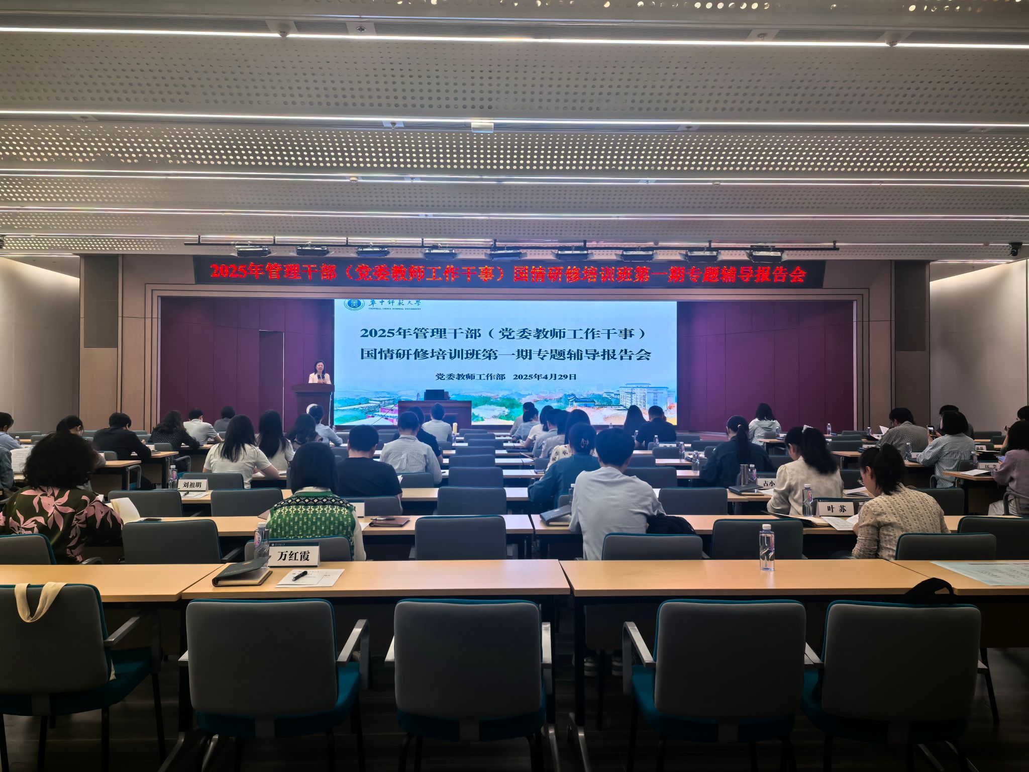 4月29日,2025年管理干部(党委教师工作干事)国情研修培训班第一期专题辅导报告会在文科楼101报告厅举行。党委教师工作部部长韩君华、党委宣传部副部长马俊、党委教师工作部副部长张艳、及各单位党委教师工作干事参会,会议特邀湖北省委网信办网络应急管理与舆情处孙善红主任作专题辅导。
