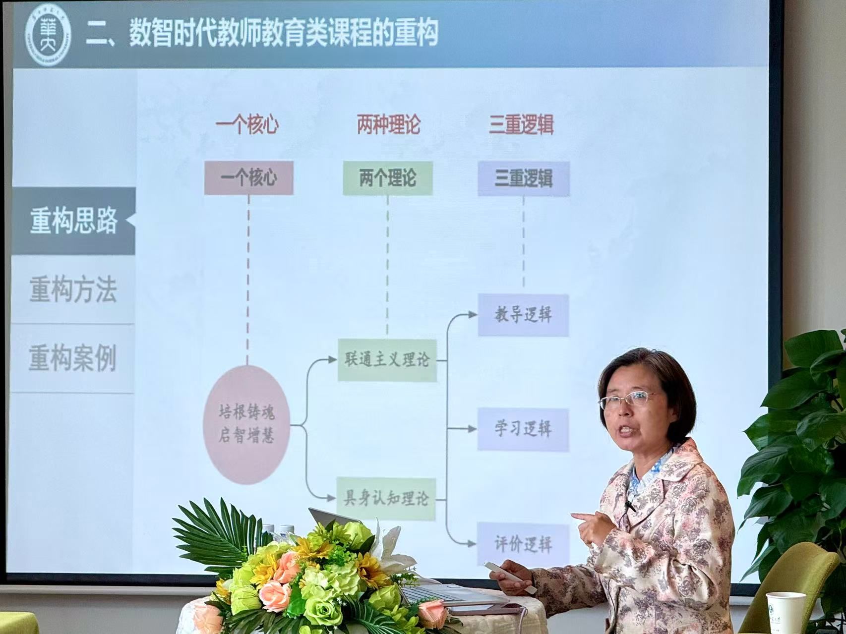 陈实教授结合新时代基础教育改革需求,深入剖析传统教师教育课程在内容滞后、技术融入不充分、情意培育不足等方面的痛点。她提出课程重构的核心思路,以“培根铸魂、启智增慧”为指引,依托联通主义学习理论与具身认知理论,构建三重逻辑体系,并阐释“三层建构、三化筑基、三融共生”的创新策略。