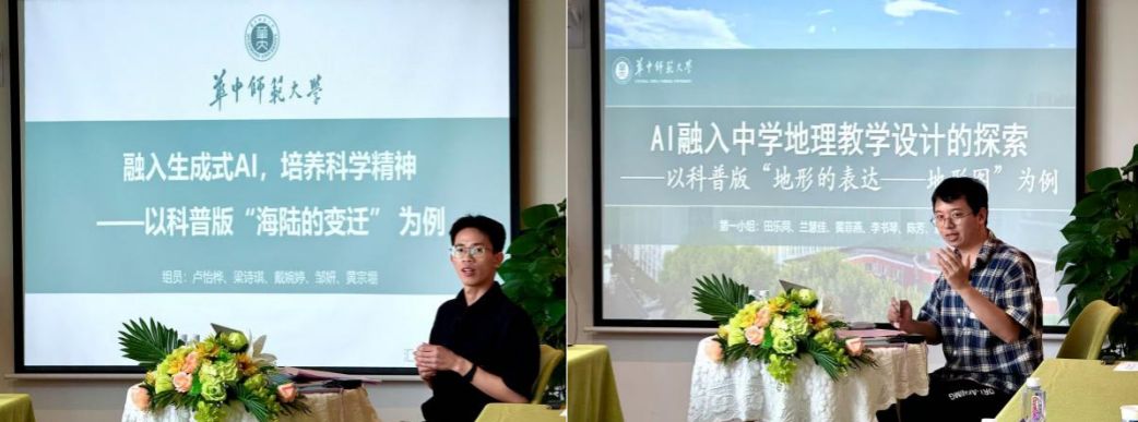 沙龙现场,两组学生代表分别展示AI赋能地理教学的实践成果。第一小组以“海陆变迁”教学为例,运用生成式AI设计虚拟科学家数字人,通过情境剧与虚拟实验引导学生经历科学理论建构过程;第二小组聚焦“地形的表达”难点,开发等高线绘制虚拟模型与红军长征数字人交互场景,通过跨学科项目式学习破解二维与三维空间转换难题。学生成果体现了“真实问题解决+技术工具创新”的课程理念,获得现场师生充分认可。